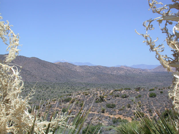 Yoshua Tree Nationalpark bei ca. 44°C - im Hintergrund schneebedeckte Rockies